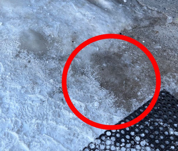 And yes, you betcha I took a photo of the ice patch that nearly sent me off the side of the mountain. I think we can all agree that the mat is in the wrong place and is clearly the villain in this scenario: